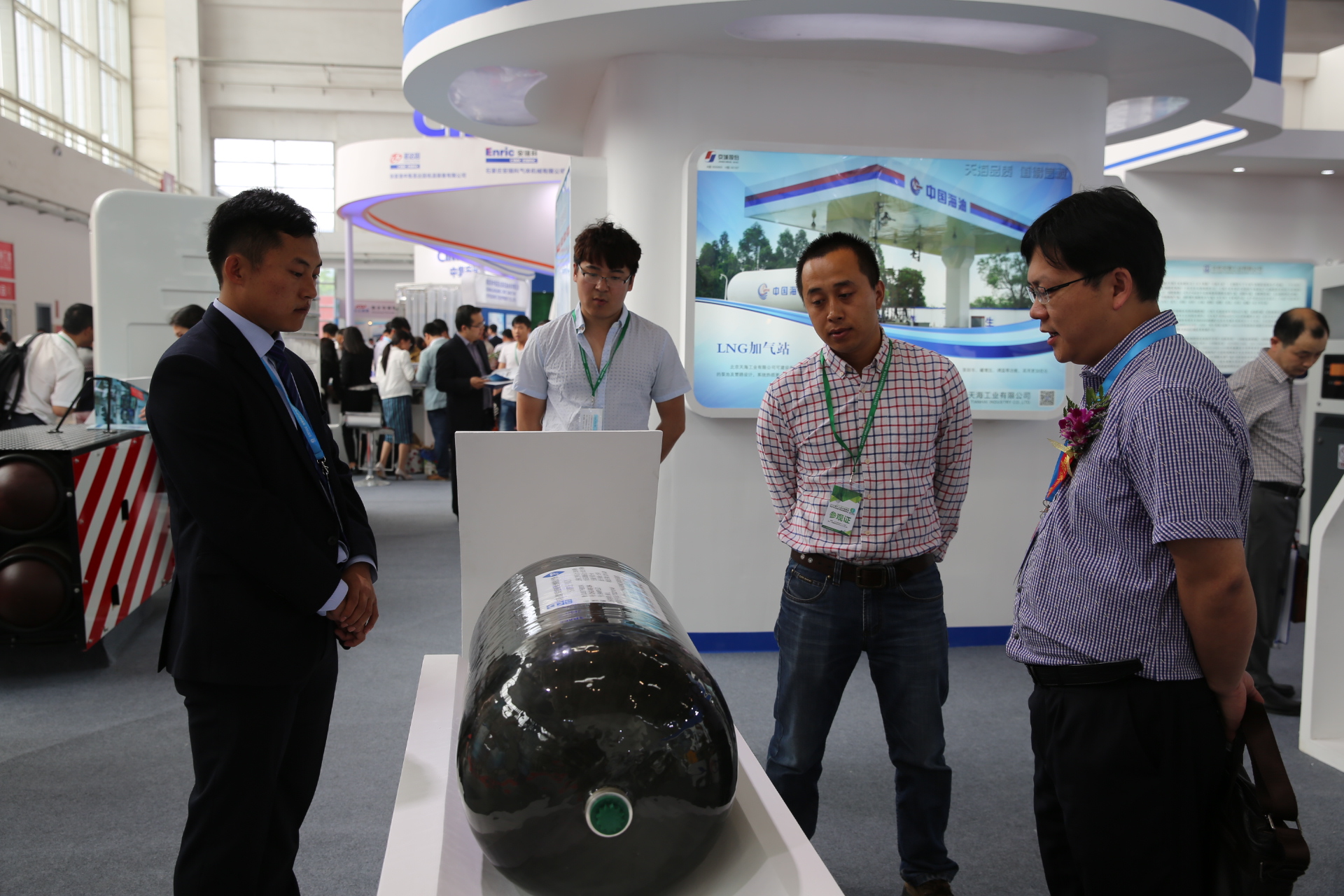 天海工业秉承高效、环保、节能的理念,致力于推动清洁能源燃料系统的发展,提供天然气储运领域全套解决方案。此次展会,不仅展出了公司全新研制的车用压缩天然气铝内胆碳纤维全缠绕复合气瓶(CNG-3型瓶)、车用压缩氢气铝内胆碳纤维全缠绕复合气瓶(CNG-3型瓶),还有公司最新研发的具有国内先进技术的LPP型车用LNG气瓶以及大直径车用LNG气瓶,更有应用于定检站维修站应用的真空降级维修设备、小型汽化站系统以及加气站物联网系统等多种全新产品。此外通过循环播放公司宣传片及精心设计的30多块展板全面展示了公司在天然气储运领域所能提供的系列产品及服务。